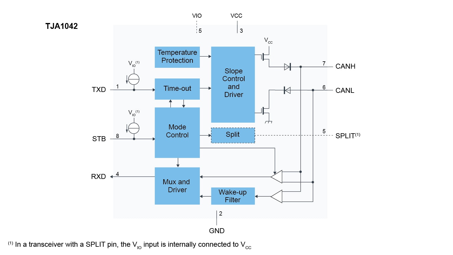 TJA1042は、電磁環境適合性 (EMC) と静電気放電 (ESD) の性能が向上しており、電源電圧がオフのときのCANバスに対する理想的なパッシブ動作、バス・ウェイクアップ機能を備えた超低消費電流スタンバイ・モードなどの特徴を備え、電源電圧が3.3 V~5 Vのマイクロコントローラと直接インターフェース可能なVIOピンを備えたバージョンもあります。