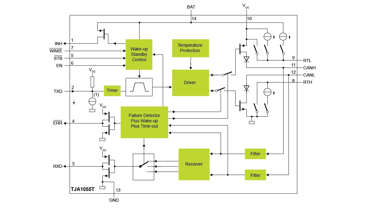 The TJA1055 is the interface between the protocol controller and the physical bus wires in a Controller Area Network (CAN). It is primarily intended for low-speed applications of up to 125 kBd in passenger cars. The device provides differential receive and transmit capability but will switch to single-wire transmitter and/or receiver in error conditions. Key highlights of the TJA1055.