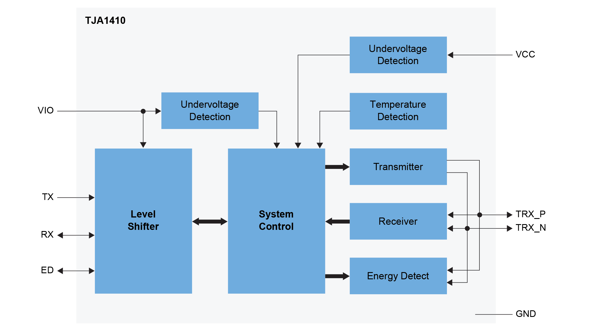 TJA1410は、OA TC14の定める適合性試験の仕様のすべてに適合しており、またASIL Bの機能安全要件を満たすようISO 26262に従って設計されています。加えて、高度な診断機能であるトポロジ・ディスカバリにも対応しています。さらに、OPEN Alliance TC14-TC10の定めるイーサネット・データ・ライン経由でのリモート・ウェイクアップに完全に対応しています。