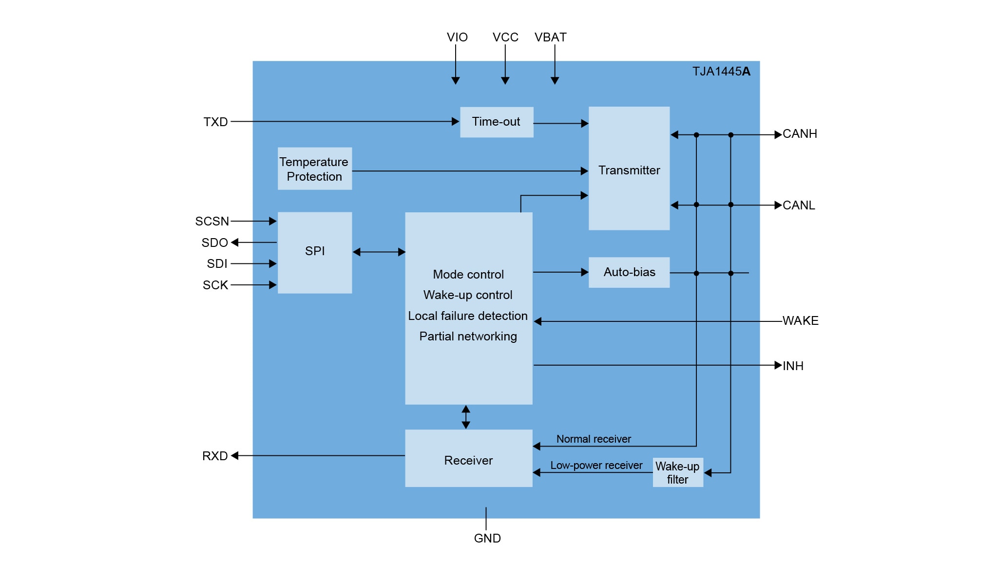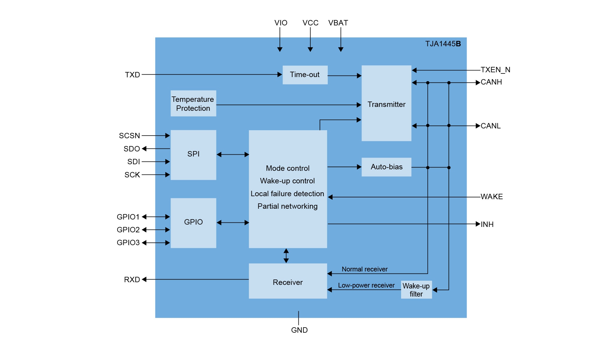 TJA1445Bは、TJA1445Aの機能をさらに拡張した機能セットを備えており、これには外部ピンによりトランスミッタを無効にするTXEN_Nピン、拡張機能(2つ目のTXD/RXDチャネルなど)セットとして設定可能な3本の汎用I/O(General-Purpose I/O:GPIO)ピンが含まれます。