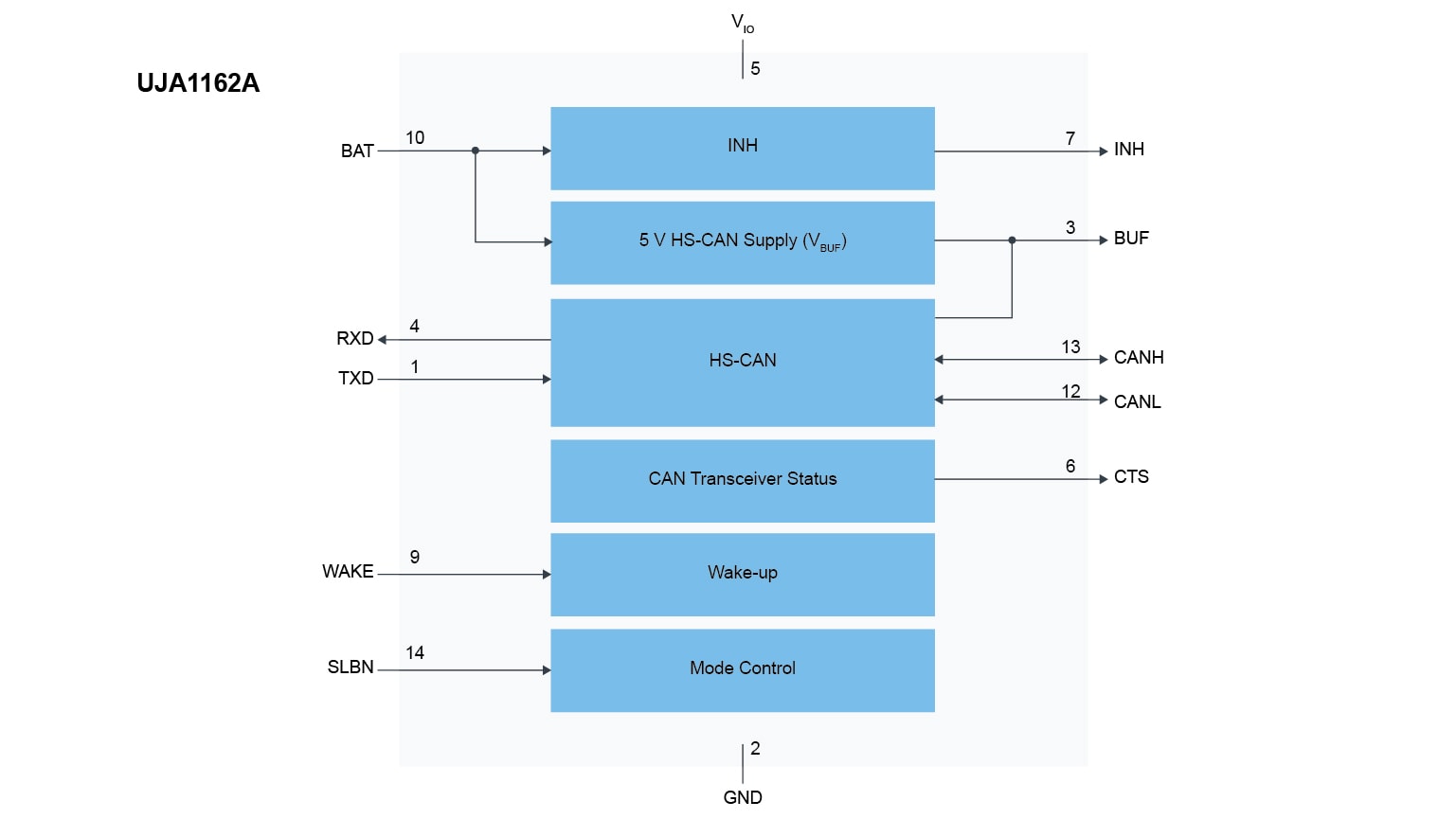 The only supply input is a battery connection. The UJA1162ATK can be operated in a very-low-current Sleep mode with bus wake-up capability.