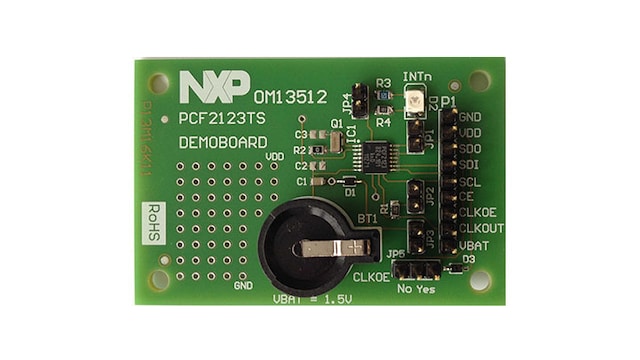 The OM13512 is the ideal evaluation/demo board to use during the design phase of any project; only the power supply and the SPI-bus must be connected. On the OM13512 the RTC PCF2123TS with SPI-bus is mounted together with a quartz crystal, a coin cell 1.5 V battery and the decoupling capacitor to buffer the supply voltage.