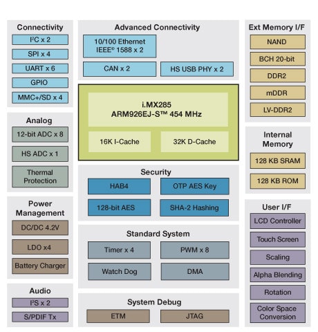 The core of the i.MX285 is Our fast, proven, power-efficient implementation of the Arm926EJ-S™ core, with speeds of up to 454 MHz. With attention to overall system cost, i.MX28 integrates physical USB interfaces (PHY), a 10/100 Ethernet, power management, and a resistive touch screen display controller. This processor with full AEC –Q100 automotive qualification is ideal for automotive infotainment systems featuring display and touch screen control systems. As a result, the i.MX285 enables many of the features only available in high-end systems, but at a price point suitable for all vehicles.