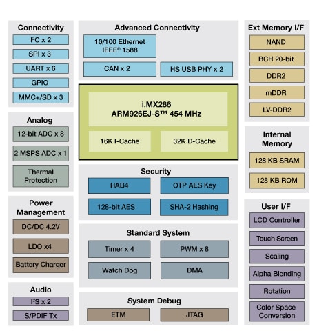 The i.MX286 has all the advantages of the low power, high-performance i.MX283 with an extra level of connectivity features by offering dual CAN support. The i.MX286 is suitable for a wide range of applications such as Human-Machine Interfaces (HMI) for Appliances, Building Contol, Factory Automation, Printers, Security Panels and factory robotics displays. Get started today building the next great portable product based on the i.MX286.