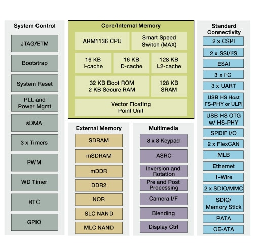 The i.MX355 processor takes advantage of the Arm11™ core running at 532 MHz with the advantage of an Image Processing Unit. The i.MX355 integrates Enhanced Serial Audio Interface (or ESAI) for multi-channel (5.1) audio, SPDIF I/O for compressed digital audio connectivity and an advanced sample rate converter (ASRC) for mixing digital content with different sampling frequencies. For flexible connectivity options the i.MX355 integrates 2-CAN modules, Media Local Bus (or MLB), Ethernet and the ability to connect to external wireless modules via SDIO or USB ports. To reduce system costs a full-speed PHY on the Host port and high-speed PHY on the On-the-go port were added. Support for lower cost memories like 3.3V SDRAM, DDR2, and multi-level cell NAND were integrated. Also included are storage device connections P-ATA and CE-ATA.