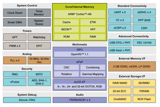 Create more sophisticated user interfaces (UIs) with the i.MX503 processor. With all of the features of the i.MX502 processor and the added OpenVG™ 2D graphics acceleration core, the i.MX503 is appropriate for a variety of display-centric applications including portable navigation and home and office automation. The i.MX503 is supported by companion NXP® power management ICs (PMIC) MC34708 and MMPF0100.