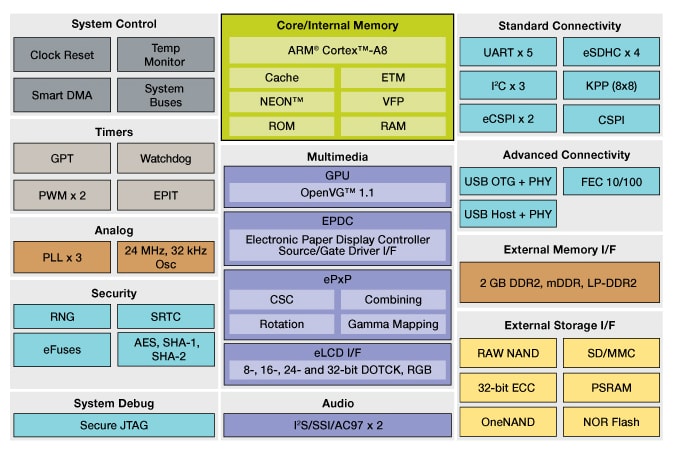 The i.MX508 processor is the first system-on-chip (SoC) designed specifically for eReaders that incorporates a high performance 800MHz Arm® Cortex®-A8 processor and an integrated hardware Electronic Paper Display (EPD) Controller certified by E Ink® to drive the latest and next generation Pearl™ panels. The i.MX508 enables reduced system cost, longer battery life and higher performance for faster page flips and a better reading experience.
