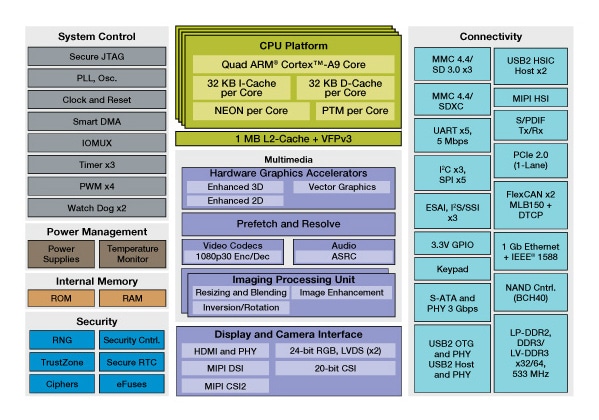 The i.MX 6QuadPlus family delivers dramatic graphics and memory performance enhancements and are pin-compatible with a broad range of i.MX 6 processors. This device encompasses a quad-core Arm® Cortex®-A9 platform running up to 1.2 GHz* with 1 MB of L2 cache, advanced graphics, prefetch and resolve engine, and optimized 64-bit DDR3 or 2-ch, 32-bit LPDDR2 support. Integrated FlexCAN, MLB busses, PCI Express® and SATA-2 provide excellent connectivity, while integration of LVDS, MIPI display port, MIPI camera port and HDMI v1.4 makes it an ideal multicore platform for a leading-edge consumer, automotive and industrial multimedia applications which require higher graphics performance.