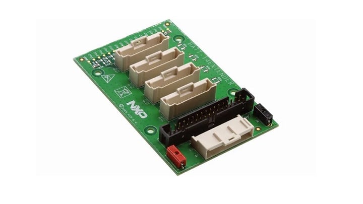 The BATT-14EXTENDER allows for the connection up to four evaluation boards using only one single battery emulator. Alternatively to the battery emulator, a divider bridge can be used to power up the EVB with an external lab power supply.