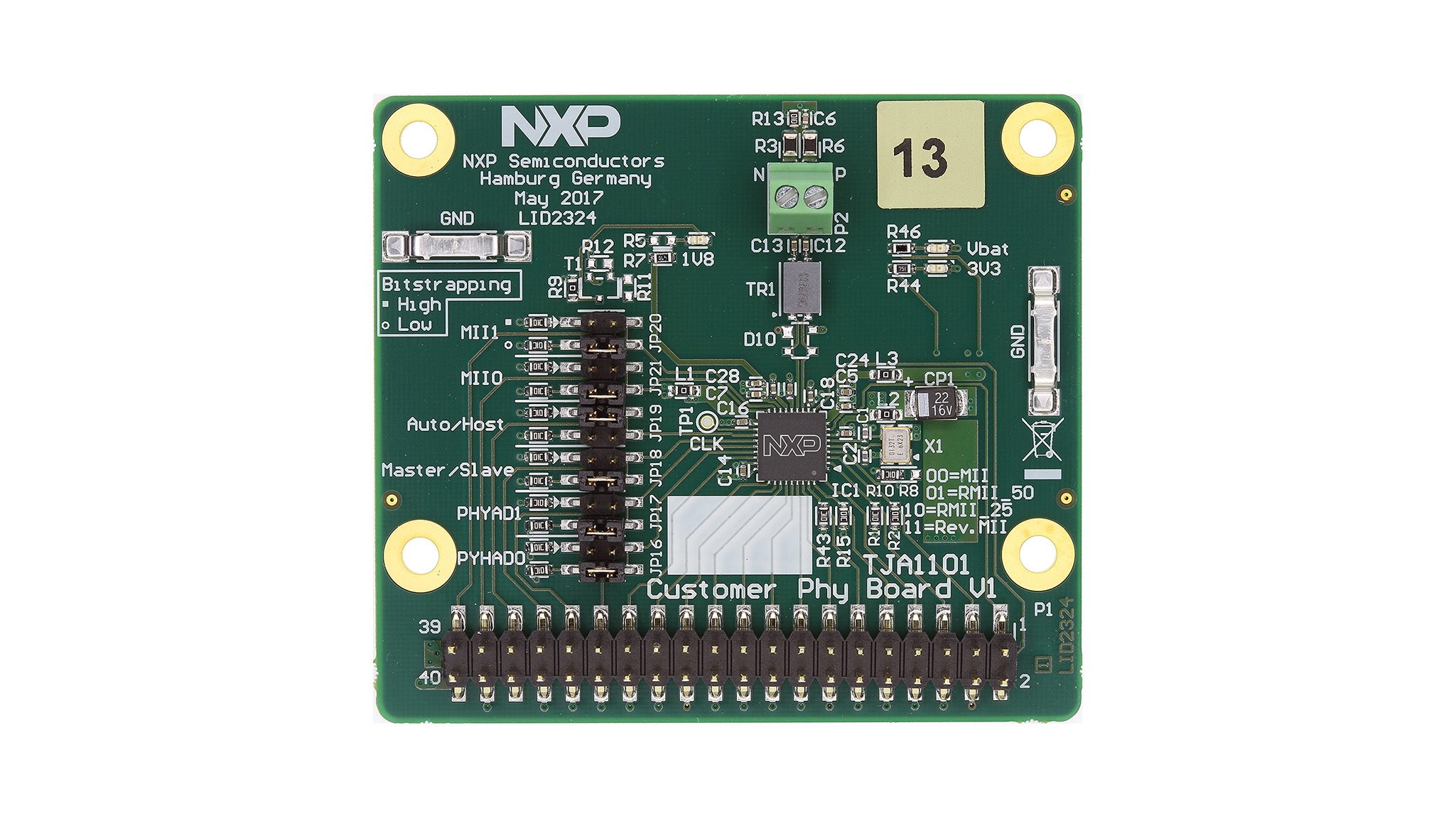 The OM14500/TJA1101 evaluation board is a low-cost hardware development tool which supports the functional evaluation of the 100BASE-T1 PHY transceiver TJA1101.