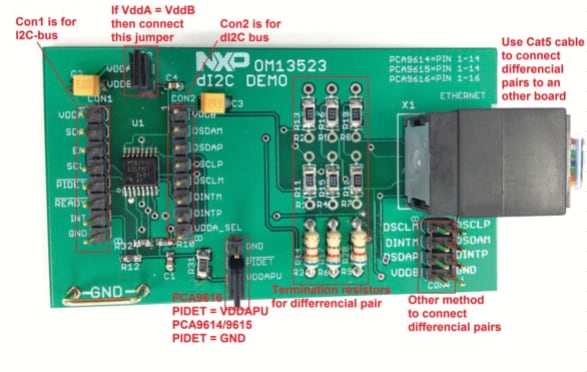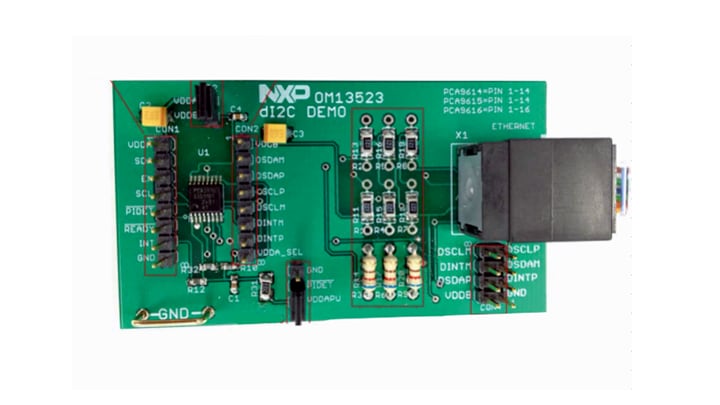 The dI²C demo board OM13523 is for a demonstration of the differential I²C-bus working better in noise and ground offset environment than standard I²C-bus. The two dI²C demo boards can be used to see the improvement of signal integrity in a noisy environment or a system that has many different power sources creating different ground offset.