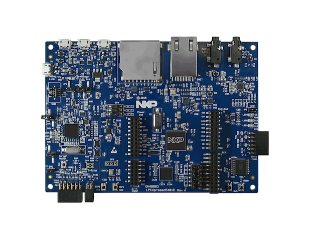 The board is comprised of target LPC54018 device with an on-board, CMSIS-DAP / SEGGER® J-Link compatible debug probe. The onboard probe is compatible with MCUXpresso IDE and other leading toolchains such as those from Keil™ and IAR®. The board is also equipped with a standard 10-pin header enabling the use of 3rd party debug probes. In addition to standard LPCXpresso V3 features, this board includes a complete set of peripheral interfaces to enable developers to fully explore the capabilities of LPC540xx devices.