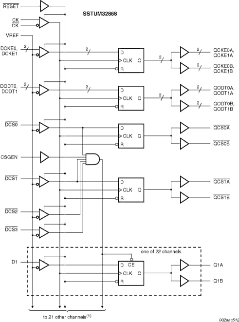 The SSTUM32868 is a 1.8 V 28-bit 1 : 2 register specifically designed for use on two rank by four (2R x 4) and similar high-density Double Data Rate 2 (DDR2) memory modules. It is similar in function to the JEDEC-standard 14-bit DDR2 register, but integrates the functionality of the normally required two registers in a single package, thereby freeing up board real-estate and facilitating routing to accommodate high-density Dual In-line Memory Module (DIMM) designs.
