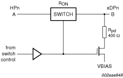 Each Host port pin (HPn) is multiplexed to one of four DIMM port pins (xDPn). The selection of the DIMM port to be connected to the Host port is controlled by a decoder driven by three hardware select pins S0, S1 and EN. Driving pin EN HIGH disconnects all DIMM ports from their respective host ports. When EN is driven LOW, pins S0 and S1 select one of four DIMM ports to be connected to their respective host port. When disconnected, any DIMM port is terminated to the externally supplied voltage Vbias by means of an on-chip pull-down resistor of typically 400 Ω. The ON-state connects the Host port to the DIMM port through a 12 Ω nominal series resistance. The design is intended to have only one DIMM port active at any time.