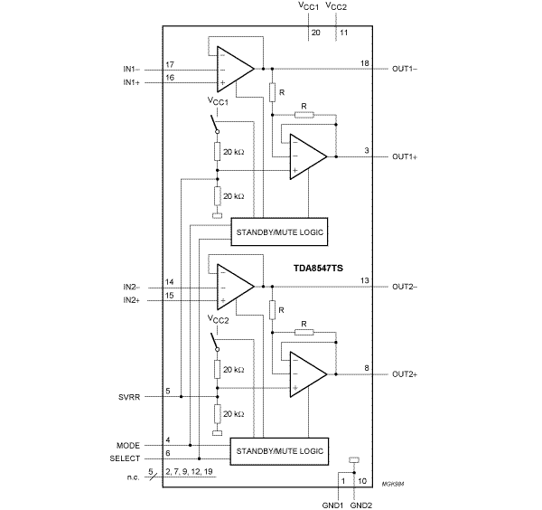The TDA8547TS is a two channel audio power amplifier for an output power of 2 x 0.7 W with a 16 Ω load at a 5 V supply. At a low supply voltage of 3.3 V an output power of 0.6 W with an 8 W load can be obtained. The circuit contains two BTL amplifiers with a complementary PNP-NPN output stage and standby/mute logic. The operating condition of all channels of the device (standby, mute or on) is externally controlled by the MODE pin. With the SELECT pin one of the output channels can be switched in the standby condition. This feature can be used for loudspeaker selection and also reduces the quiescent current consumption. When only one channel is used the maximum output power is 1.2 W.