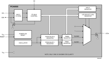 The PCA9550 LED blinker blinks LEDs in I²C-bus and SMBus applications where it is necessary to limit bus traffic or free up the I²C controller's (MCU, MPU, DSP, chip set, etc.) timer. The uniqueness of this device is the internal oscillator with two programmable blink rates. To blink LEDs using normal I/O expanders like the PCF8574 or PCA9554, the bus controller must send repeated commands to turn the LED on and off. This greatly increases the amount of traffic on the I²C-bus and uses up one of the controller's timers. The PCA9550 LED blinker instead requires only the initial set-up command to program BLINK RATE 1 and BLINK RATE 2 (i.e., the frequency and duty cycle). From then on, only one command from the bus controller is required to turn each individual open-drain output ON, OFF, or to cycle at BLINK RATE 1 or BLINK RATE 2. Maximum output sink current is 25 mA per bit and 50 mA per package.