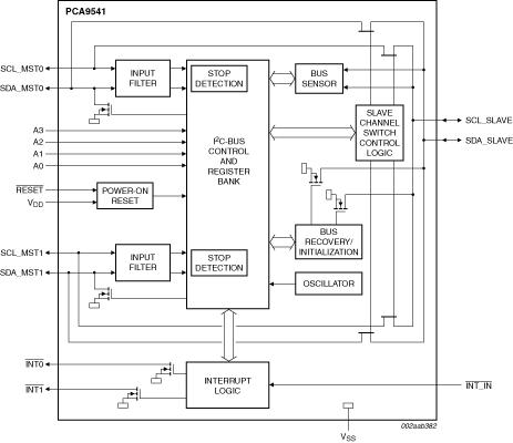 The interrupt outputs are used to provide an indication of which controller has control of the bus. One interrupt input (INT IN) collects downstream information and propagates it to the 2 upstream I²C-buses (INT0 and INT1) if enabled. INT0 and INT1 are also used to let the previous bus controller know that it is not in control of the bus anymore and to indicate the completion of the bus recovery/initialization sequence. Those interrupts can be disabled and will not generate an interrupt if the masking option is set.