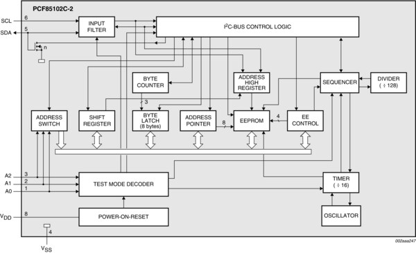 Data bytes are received and transmitted via the serial I²C-bus. Up to eight PCF85102C-2 devices may be connected to the I²C-bus. Chip select is accomplished by three address inputs (A0, A1 and A2).