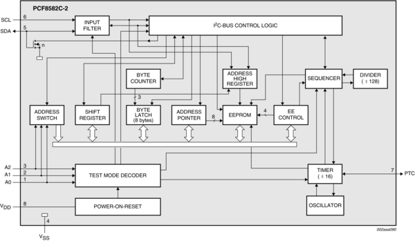 The PCF8582C-2 is a floating gate Electrically Erasable Programmable Read Only Memory (EEPROM) with 2 kbits (256 x 8-bit) non-volatile storage. By using an internal redundant storage code, it is fault tolerant to single bit errors. This feature dramatically increases the reliability compared to conventional EEPROMs. Power consumption is low due to the full CMOS technology used. The programming voltage is generated on-chip, using a voltage multiplier.