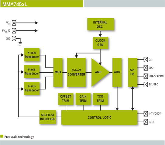 The MMA745xL series is a digital output (I²C/SPI), low-power, low-profile capacitive micromachined accelerometer featuring signal conditioning, a low pass filter, temperature compensation, self-test configurable to detect zero-g through interrupt pins (INT1 or INT2) and pulse detect for quick motion detection. Zero-g offset and sensitivity are factory set and require no external devices. The zero-g offset can be customer calibrated using assigned zero-g registers and g-select which allows for command selection for three acceleration ranges (2g/4g/8g). The MMA745xL series includes a standby mode that makes it ideal for handheld battery-powered electronics.