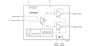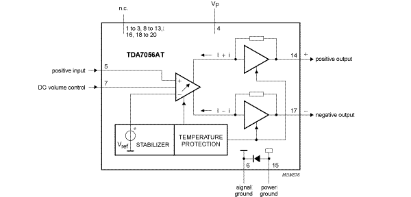 The TDA7056AT is a mono Bridge-Tied Load (BTL) output amplifier with DC volume control. It is designed for use in TVs and monitors, but is also suitable for battery-fed portable recorders and radios. The device is contained in a 20-lead small outline package.