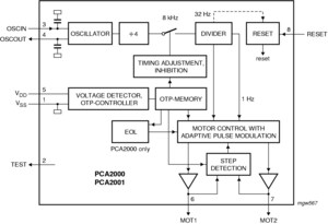 The PCA2000 and PCA2001 are CMOS integrated circuits for battery operated wrist watches with a 32 kHz quartz crystal as timing element and a bipolar 1 Hz stepping motor. The quartz crystal oscillator and the frequency divider are optimized for minimum power consumption. A timing accuracy of 1 ppm is achieved with a programmable, digital frequency adjustment.