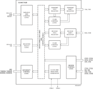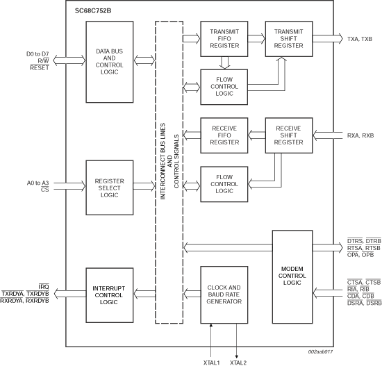 The SC68C752B is a dual Universal Asynchronous Receiver/Transmitter (UART) with 64-byte FIFOs, automatic hardware/software flow control, and data rates up to 5 Mbit/s. The SC68C752B offers enhanced features. It has a Transmission Control Register (TCR) that stores receiver FIFO threshold levels to start/stop transmission during hardware and software flow control. With the FIFO Rdy register, the software gets the status of TXRDYn/RXRDYn for all four ports in one access. On-chip status registers provide the user with error indications, operational status, and modem interface control. System interrupts may be tailored to meet user requirements. An internal loopback capability allows on-board diagnostics.