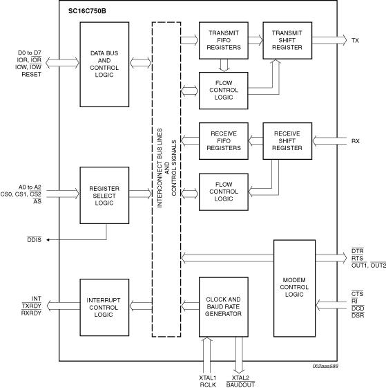 The SC16C750B is a Universal Asynchronous Receiver and Transmitter (UART) used for serial data communications. Its principal function is to convert parallel data into serial data, and vice versa. The UART can handle serial data rates up to 3 Mbit/s.