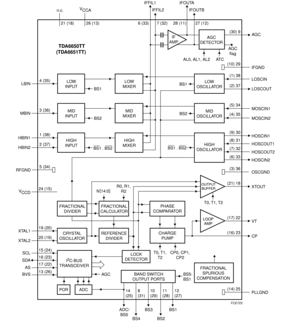 The TDA6650TT; TDA6651TT is a programmable 3-band mixer/oscillator and low phase noise PLL synthesizer intended for pure 3-band tuner concepts applied to hybrid (digital and analog) or digital only terrestrial and cable TV reception.