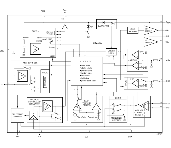 The IC is a monolithic integrated circuit for driving electronically ballasted fluorescent lamps, with mains voltages up to 277 V (RMS) (nominal value). Besides the drive function, the IC also includes the level-shift circuit, the oscillator function, a lamp voltage monitor, a current control function, a timer function and protections.