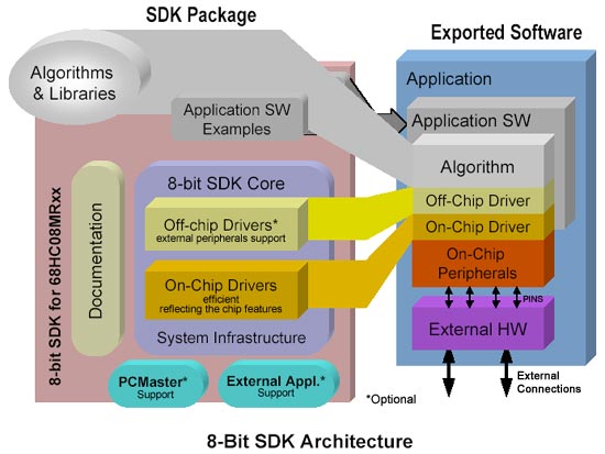 The 68HC908MR Quick Start Software Development Kit has been developed to compliment the existing development environment for the NXP® 68HC908MR series of 8-bit microcontrollers. It provides a software infrastructure that allows development of efficient software applications that are portable and reusable between different chips of the 68HC08 architecture. Maximum portability is achieved for devices with comparable on-chip peripheral modules. The tool contains fully-debugged peripheral drivers, algorithm libraries and example applications. The libraries are targeted mainly for the motor control applications. The 68HC908MRQS Quick Start Software Development Kit supports both the Metrowerks and Cosmic compilers.