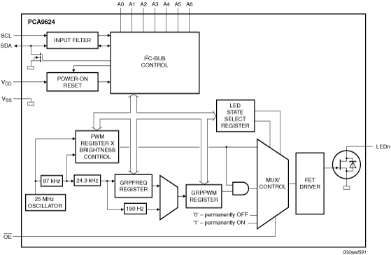 The active LOW Output Enable input pin (OE) blinks all the LED outputs and can be used to externally PWM the outputs, which is useful when multiple devices must be dimmed or blinked together without using software control.