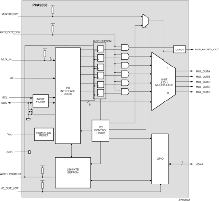 The PCA9558 is a highly integrated, multi-function device that is composed of a 5-bit multiplexed/1-bit latched 6-bit I²C-bus/SMBus EEPROM DIP switch, an 8-bit I/O expander and a 2-kbit serial EEPROM with write protect. The PCA9558 integrates these commonly used components into a single chip to reduce component count and board space requirements and is useful in computer, server and telecom/networking applications.
