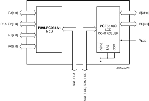 The P89LPC9402 is a multi-chip module consisting of a P89LPC931A1 single-chip microcontroller combined with a PCF8576D universal LCD driver in a low-cost 64-pin package. The LCD driver provides 32 segments and supports from 1 to 4 backplanes. Display overhead is minimized by an on-chip display RAM with auto-increment addressing.
