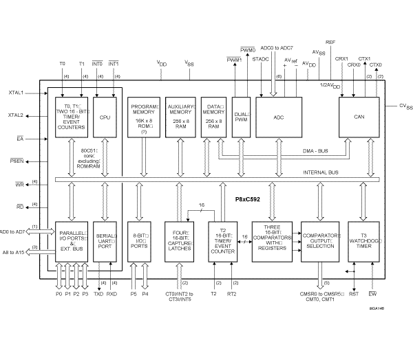 The P8xC592 is a single-chip 8-bit high-performance microcontroller with on-chip CAN-controller, derived from the 80C51 microcontroller family.