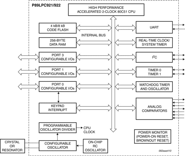 • Active-LOW reset. On-chip power-on reset allows operation without external reset components. A reset counter and reset glitch suppression circuitry prevent spurious and incomplete resets. A software reset function is also available.