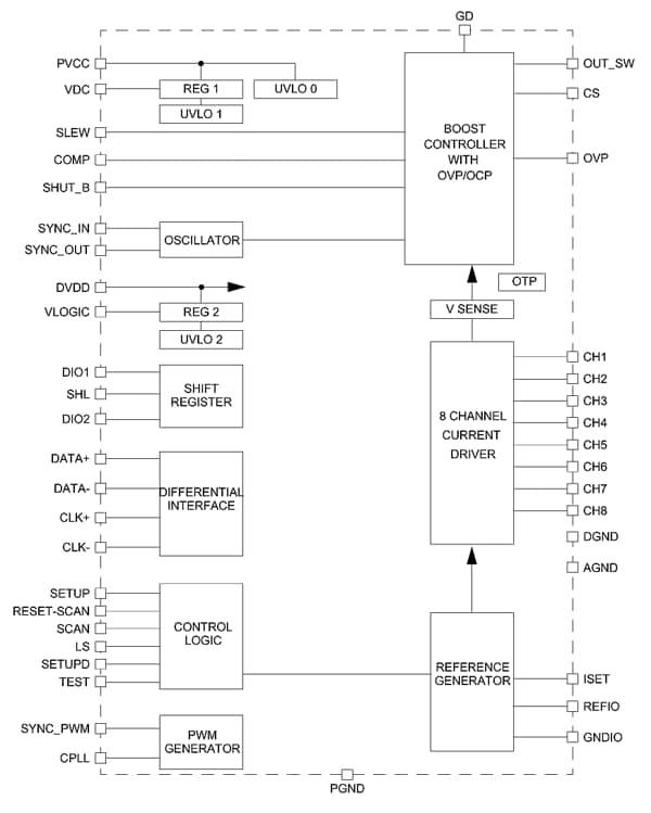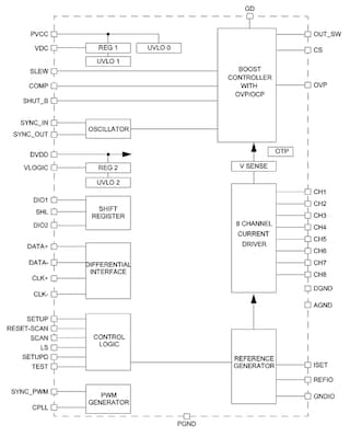 The MC34848 is a high efficiency, 8-channel LED driver for use in LCD backlighting applications. It is designed to support up to 160 mA /channel in scan backlight mode, or 80 mA/channel in local dimming mode. Current reference is set using a single resistor to GND and the LED current tolerance is accurate to ±1% channel-to-channel and IC-to-IC. The current can be programmed in both local dimming and scan modes. Each channel has independent PWM control with 10-bit resolution, programmed with high speed differential interface.