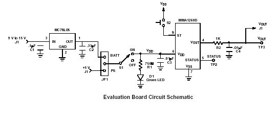The MMA1260D is a z-axis 1.5g accelerometer with an analog output. The MMA1260D can be used for a variety of tilt applications, free-fall detection applications, and anti-theft applications. The MMA1260D evaluation board features a 5V power interface with an optional 9-15V power interface which allows the user to provide power with a battery. The board includes a push button for using the self-test feature of the MMA1260D and multiple test points. This kit is supplied for preliminary evalution purposes. This evaluation kit was populated with a production (MMA1260D) device. Current revisions of the data sheet are available on the Web.