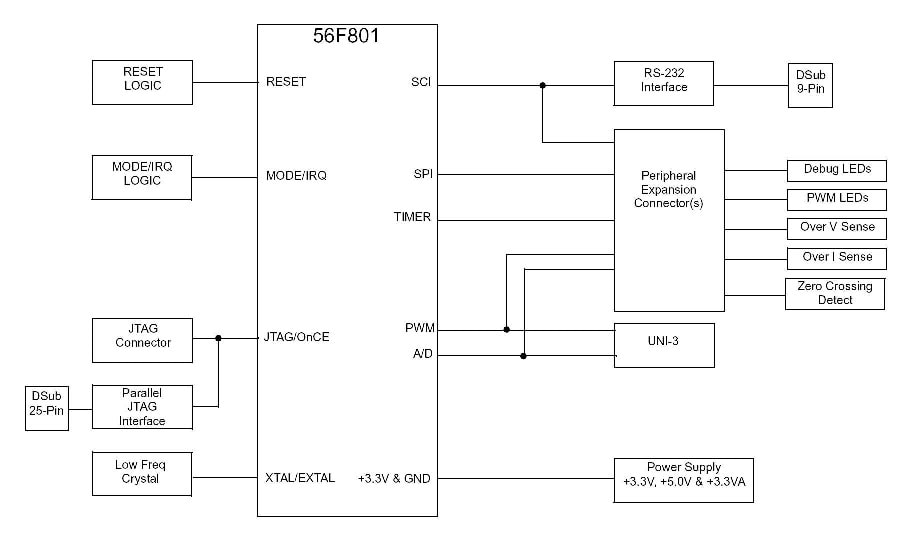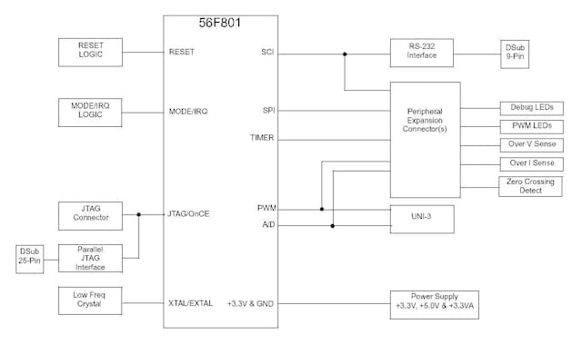 The 56F801EVM kit is a low-cost kit that contains everything you need to quickly evaluate the features and capabilities of the 56F801 Digital Signal Controller and tools. It also provides an efficient and cost-effective vehicle for hardware and software development. It can be used alone or in conjunction with Our broad range of modular motion control development hardware. The DSP56F801EVM Kit is targeted for use on PC-compatible systems running Windows 95, Windows 98, Windows 2000, Windows ME and Windows NT 4.0.