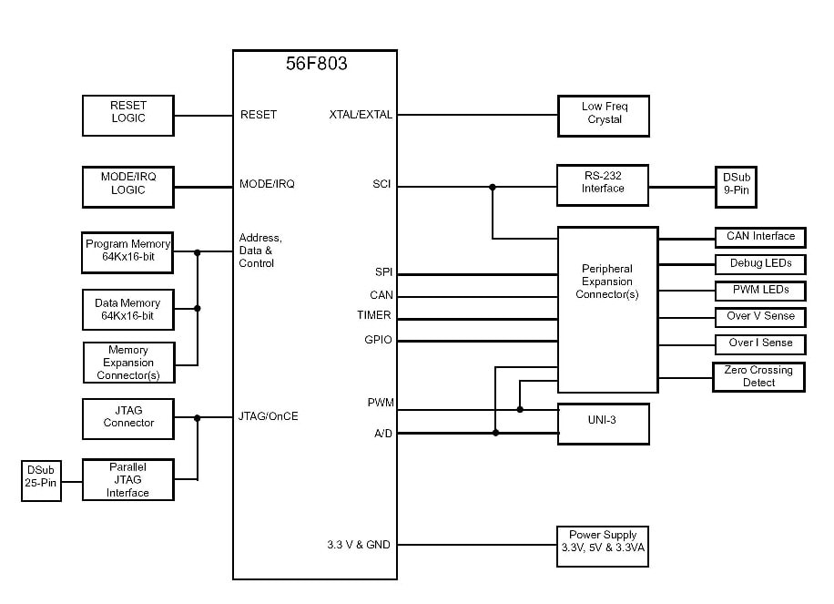 The 56F803EVM kit is a low-cost kit that contains everything you need to quickly evaluate the features and capabilities of the 56F803 Digital Signal Controller and tools. It also provides an efficient, cost-effective vehicle for hardware and software development. It can be used alone or in conjunction with Our broad range of modular motion control development hardware. The DSP56F803EVM Kit is targeted for use on PC-compatible systems running Windows 95, Windows 98, Windows 2000, Windows ME and Windows NT 4.0.