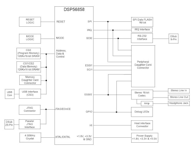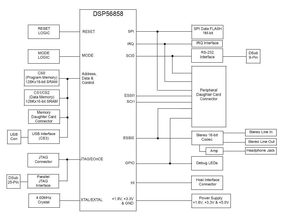 The DSP56858EVM is designed as a versatile Digital Signal Controller, (DSC), development card for developing real-time software and hardware products to support a new generation of applications in digital and wireless messaging, digital answering machines, feature phones, modems, and digital cameras. The DSP56858EVM demonstrates the abilities of the DSP56858 device and provides a hardware tool to develop applications using the DSP56858.