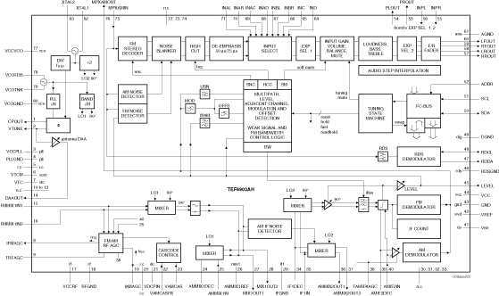 FM tuner with double conversion to IF1 = 10.7 MHz and IF2 = 450 kHz with integrated image rejection for both IF1 and IF2; integrated channel filter with variable bandwidth control; capable of US FM, Europe FM, Japan FM and Eastern Europe FM. AM tuner with double conversion to IF1 = 10.7 MHz and IF2 = 450 kHz; capable of Long Wave (LW), Medium Wave (MW) and full range Short Wave (SW) (11 m to 120 m bands).