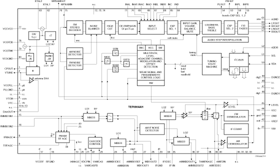 The TEF6903A is a single-chip car radio integrated circuit with FM/AM tuner, stereo decoder, weak signal processing and audio processing. Radio Data System (RDS)/Radio Broadcast Data System (RBDS) demodulator for radio data reception is included.