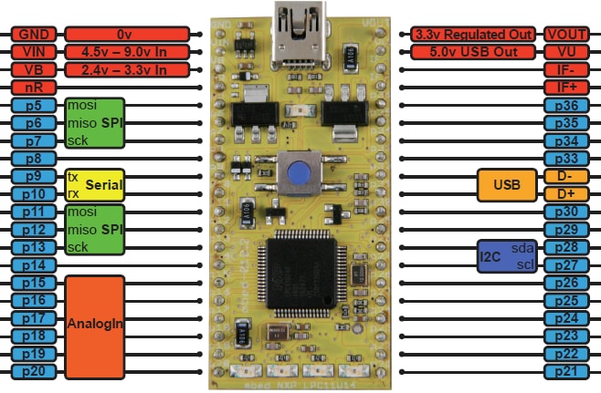 The mbed NXP® LPC11U24 Microcontroller in particular is designed for prototyping low cost USB devices, battery powered applications and 32-bit Arm® Cortex™-M0 based designs. It is packaged as a small DIP form-factor for prototyping with through-hole PCBs, stripboard and breadboard, and includes a built-in USB FLASH programmer.