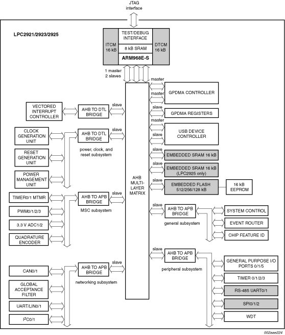 The LPC2921/2923/2925 combine an ARM968E-S CPU core with two integrated TCM blocks operating at frequencies of up to 125 MHz, Full-speed USB 2.0 device controller, CAN and LIN, up to 40 kB SRAM, up to 512 kB flash memory, two 10-bit ADCs, and multiple serial and parallel interfaces in a single chip targeted at consumer, industrial, and communication markets. To optimize system power consumption, the LPC2921/2923/2925 has a very flexible Clock Generation Unit (CGU) that provides dynamic clock gating and scaling.