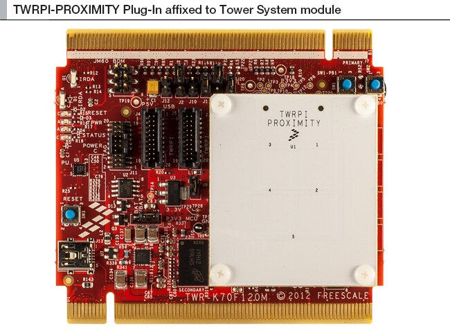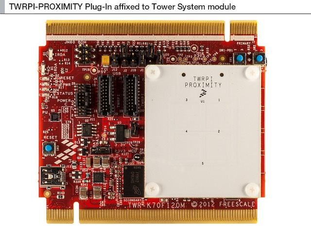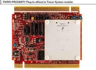 The TWRPI-PROXIMITY plug-in for the Tower® System enables the evaluation of capacitive proximity sensing in your embedded designs. This plug-in, or daughter card, is compatible with Tower System modules that feature the touch-sensing interface and provides proximity detection of up to one inch (1"). Simply place the TWRPI-PROXIMITY onto a parent controller or peripheral module, and start sensing.
