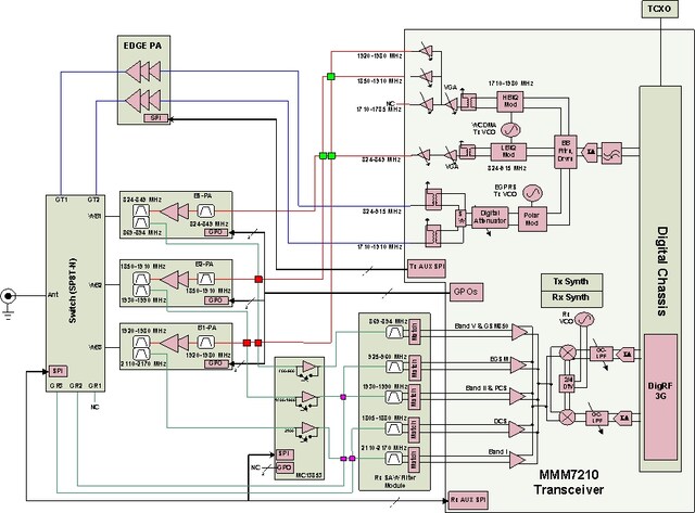 The MMM7210B cellular transceiver covers five RX input and six TX output transmit and receive frequency bands. It features Our polar 2G GSM/EDGE and 3G W-CDMA modulation transmit architecture with direct modulation of the VCO by a fractional-N synthesizer. TX VCO is fully integrated. The receiver architecture features direct conversion: integrated VCO with fractional N synthesizer. It uses DigRF for baseband interface and comes in a 170-pin 9.25 mm x 7.65 mm land grid array (LGA).