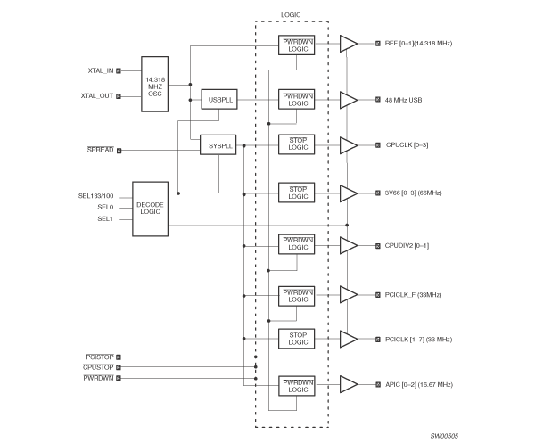 The part possesses dedicated power-down, CPUSTOP, and PCISTOP input pins for power management control. These inputs are synchronized on-chip and ensure glitch-free output transitions. When the CPUSTOP input is asserted, the CPU clock outputs and 3V66 clock outputs are driven LOW. When the PCISTOP input is asserted, the PCI clock outputs are driven LOW.