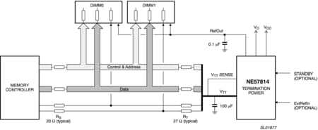 The NE57814 is designed to provide power for termination of a DDR memory bus. It significantly reduces parts count, board space, and overall system cost over previous switching solutions. The NE57814 has an independent power source pin (VD) for further reducing the operational power and a standby low-power mode for energy-sensitive portable applications.