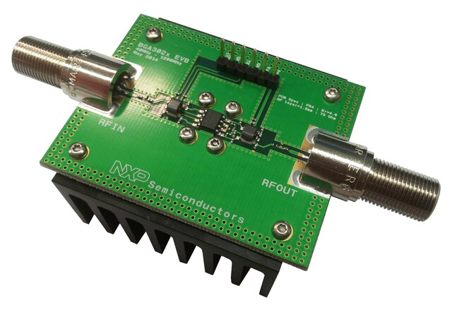 The BGA3021 medium power CATV amplifier kit simplifies the evaluation of the BGA3021 wideband amplifier. It contains an RF board matched to 75 Ohm from 40 MHz up to 1200 MHz with F-connectors. The board operates between 5 V and 8 V.